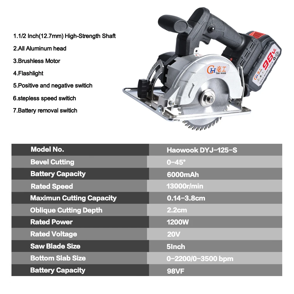 Product Name: 98VF Circular Electric Saw 45° Bevel 30mm Cuttiing Depth 125mm Woodworking Blade For Wood 6000mAh Circular Saw Wood Tools